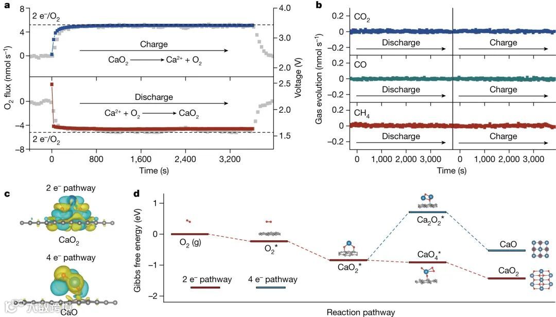 使用原位微分电化学质谱(DEMS)在1 A g−1 的恒定电流密度和 1000 mAh g−1 的容量下量化阴极反应(图2a)。实验结果表明放电过程主要基于双电子转移电化学反应(Ca2++2e-+O2→CaO2;图1b,插图)。这表明在Ca-O2电池中,O2/CaO2的双电子化学反应是可逆的,这与人们认为Ca-O2电池中发生的迟缓的四电子转移反应相反。图2b进一步证实了CaO2形成-分解是该Ca-O2电池中的主要反应。以CaO2作为放电产物的双电子反应途径,在热力学和动力学上有利于Ca-O2电池的可逆性。微分电荷密度计算表明,与CaO(四电子反应途径中的放电产物)相比,CaO2与碳基空气阴极表现出更好的电子转移(图2c),因此表明O2被促进还原。然后使用密度泛函理论计算比较通过二电子和四电子转移的O2还原途径(图2d)。双电子机制表现出较低的吉布斯自由能差在室温下比四电子机制(ΔGCaO = −0.53 eV)好,主要归因于CaO2形成过程中不存在O-O键断裂。作为逆反应,CaO2的分解在最小充电电位3.36 V下也是可行的,与循环实验一致(图1b,c)。因此,2e−CaO2的形成-分解为在室温下电化学可逆Ca-O2电池铺平了道路。