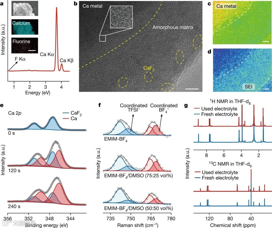 在检查从重新充电的Ca-O2电池中拆卸下来的阳极时,作者发现了新沉积的深灰色微尺度Ca(图3a)。根据钙氟比推断,钙与氟化钙(Ca:CaF2)的平均摩尔比为13:1(图3a),这初步表明Ca-O2电池中存在可逆的钙剥离-电镀现象。低温透射电子显微镜(CRYO-TEM)图像(图3b-d)和X射线光电子能谱(XPS)深度剖面图(图3e)进一步证实,充电阳极由金属Ca组成,表面覆盖着一层富含CaF2的SEI。