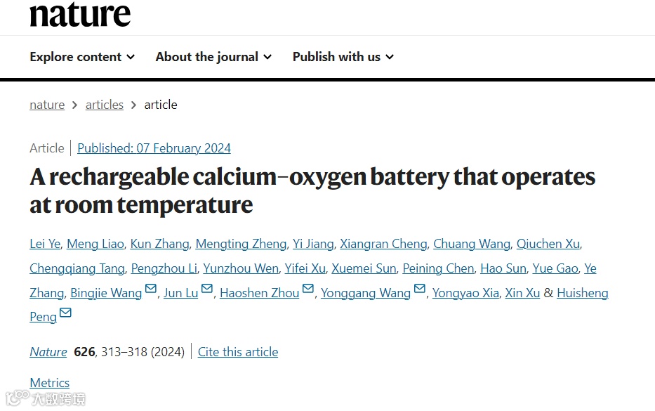 2024年2月7日,相关成果以 “A rechargeable calcium–oxygen battery that operates at room temperature ” 为题发表在Nature上。复旦大学叶蕾博士(现为宾夕法尼亚州立大学博士后)、廖萌博士、2023级博士研究生张琨为论文共同第一作者,王兵杰副研究员、陆俊教授、周豪慎教授、王永刚教授、彭慧胜教授为论文共同通讯作者,复旦大学化学系徐昕教授等为论文共同作者。