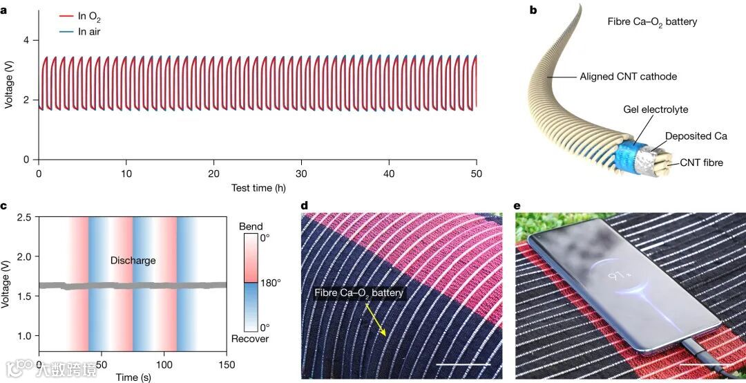 得益于以离子液体为基础的耐用电解质,Ca-O2电池在空气或纯净的氧气中表现出相似的行为(图4a),在空气中的循环寿命为450次(1 A g-1 和 500 mAh g-1)。作者试图将Ca-O2电池转化为安全、可持续的可穿戴储能解决方案,因为它的电化学性能、钙金属形成枝晶的低倾向性以及耐空气离子液体电解质完全符合可穿戴电子设备的要求。作为演示,在钙沉积的碳纳米管纤维阳极上涂覆了离子液体凝胶电解质,然后在纤维外侧包裹了排列整齐的碳纳米管阴极片,从而构建了柔性Ca-O2纤维电池(图4b)。将钙沉积到柔性CNT纤维上可避免使用过量的钙金属,也可避免传统平面钙电池中使用的整体钙金属加工性差的问题。当从0°弯曲到180°时,纤维电池继续稳定放电,并在约1.7 V的电压下保持稳定(图4c)。作者使用商用编织机将这些纤维电池编织成了透气、柔韧的电池纺织品(图 4d),可为手机等电子设备供电(图 4e)。