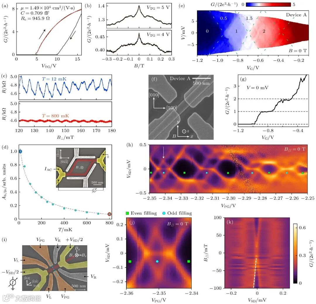 图2 PbTe纳米线的输运特征 (a) 场效应迁移率[17];(b) 反弱局域效应[17];(c),(d) AB效应[21];(e)—(g) QPC器件中的弹道输运[25];(h)—(k) 量子点中的库仑阻塞效应[22]