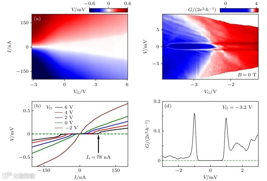 图3 PbTe-Pb杂化纳米线中的超导近邻效应 (a),(b)约瑟夫森结中的超流[24];(c),(d)隧道结中的超导硬能隙[26]