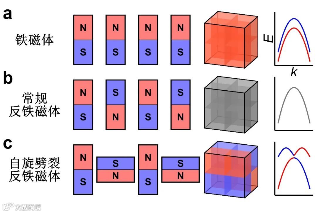 固体材料的磁性来源于构成晶格的原子的磁矩的有序排布,带有磁矩的磁性原子可以被看作一个具有南北极的微小磁铁。铁磁体 (ferromagnet) 具有宏观磁性,是晶体中所有磁性原子的磁矩都沿同一方向排列造成的(图1a)。反铁磁体 (antiferromagnet) 没有宏观磁性,则是晶体中磁性原子的磁矩沿着相反的方向规律排布造成的(可以是由图1b所示的“上下上下”,也可以是“上上下下”),这使得材料的总磁矩为零。
