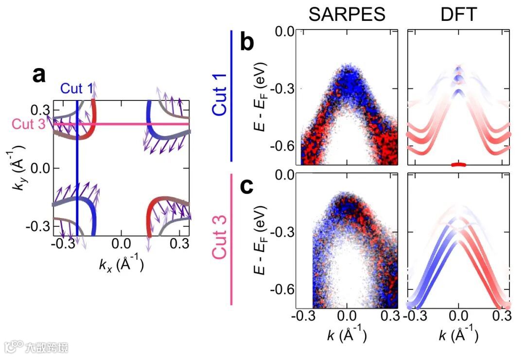 图2 利用密度泛函理论 (DFT) 和自旋-角分辨光电子能谱 (SARPES) 研究MnTe2的电子结构,图中的蓝色和红色代表两种不同的自旋。a,DFT计算得到的自旋分辨等能面,定义自旋Sα沿kα方向(α = x, y, z)。b和c分别为SARPES和DFT计算得到的沿Cut 1和Cut 3的自旋分辨能带