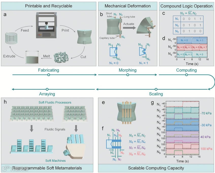 近日,浙江大学邹俊教授团队介绍了一种可打印和可回收的软超构材料,它们具有可重新编程的嵌入式智能,可调节软机器的变形。这些超构材料由相互连接和周期性排列的逻辑单元构成,能够执行耦合乘法和非的复合逻辑运算。单元的可扩展计算能力使其能够同时处理不同类型和幅度的多个流体信号,从而允许执行复杂的高级控制操作。通过建立物理布尔代数定律并制定通用设计路线,可以轻松创建和重新编程能够进行多种逻辑运算的软超构材料。此外,通过构建软锁存解复用器、能够进行通用和可定制变形编程的软控制器以及无需重新连接的可重新编程处理器,验证了超构材料直接用作软机器流体处理器的潜力。这项工作提供了一种创建可重编程的软流体控制系统的简便方法,以满足动态情况下的按需要求。相关研究发表在《Advanced Science》上。(徐锐)