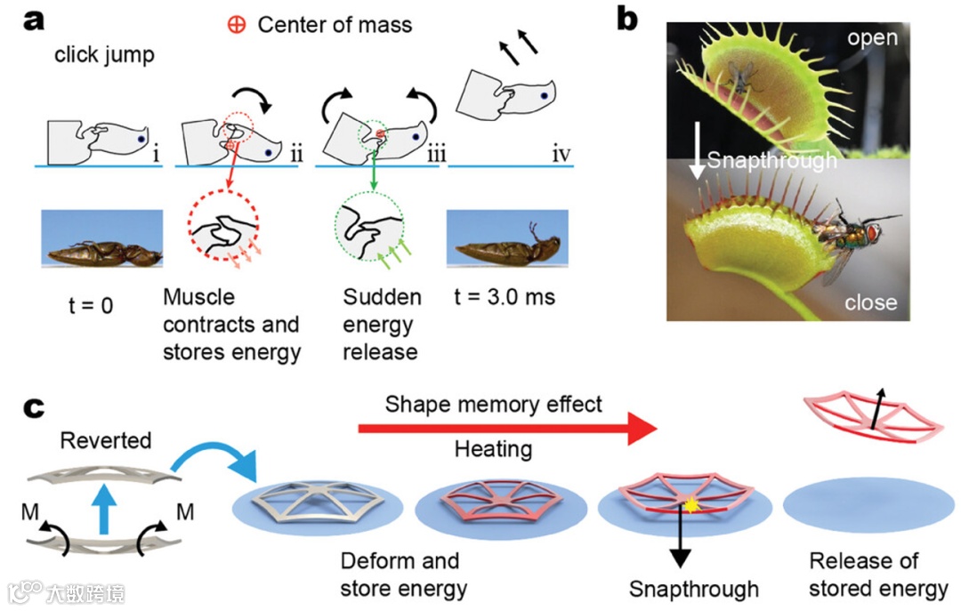 受大自然的启发,软体机器人表现出很高的顺应性,使其能够有效地适应各种环境。在模仿这些运动模式(飞行、爬行、跳跃和游泳等)中,跳跃作为一种穿越非结构化环境的有效方式引起了人们的极大兴趣。然而,由于体型的影响,复制小型生物的跳跃运动给软体机器人带来了巨大挑战。与传统笨重的驱动器相比,轻巧高效的响应式驱动器有可能克服尺寸和质量的限制。响应材料可以在光、热、电或磁等外部刺激下发生大幅变形。将智能驱动器与软体机器人相结合,已经产生了大量性能卓越的智能小型软体机器人。其中,电刺激软机器人反应速度快,适合跳跃应用。然而,直接能量输出跳跃机器人遇到的挑战与系统内能量传递效率低下导致的瞬时功率输出有限有关。因此,它们的跳跃高度往往不高。响应式跳跃机器人的跳跃高度主要取决于所采用的智能驱动器单位质量的能量输出。与其他智能材料相比,形状记忆合金(SMAs)具有良好的功重比,非常适合小型跳跃机器人。然而,作为热响应材料,SMAs的响应速度本身是有限的。因此,可以再次利用咬合机制来提高SMAs的瞬时功率输出。