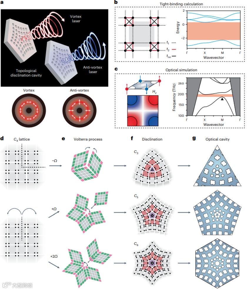光矢量涡旋为数据传输中生成空间可区分通道提供了额外的自由度。使用具有不对称散射体、平面螺旋纳米结构、微柱链和对称光子晶体板的微环谐振器已成功实现了几种涡旋微型激光器。尽管这些涡旋光束在定向输出和产生效率方面表现出色,但在构建超小型光学器件时,由于缺乏高质量(高Q)的光限制,同时保持光学涡旋仍然具有挑战性。而光子拓扑绝缘体(PTI)被认为是实现光鲁棒操控光的有力工具。PTI 的研究已扩展到拓扑晶体绝缘体 (TCI) 中的拓扑缺陷,例如位错和向错,这些缺陷通常破坏周期性结构的几何对称。值得注意的是,分数向错电荷属于高阶拓扑绝缘体(HOTI)类,可作为拓扑束缚态被捕获在向错缺陷的边界。虽然向错缺陷已在微波电路和毫米级光子系统中利用人造TCI超材料进行了实验证明,但向错尚未应用于纳米光子学以实现量子化拓扑电荷的超小光源。