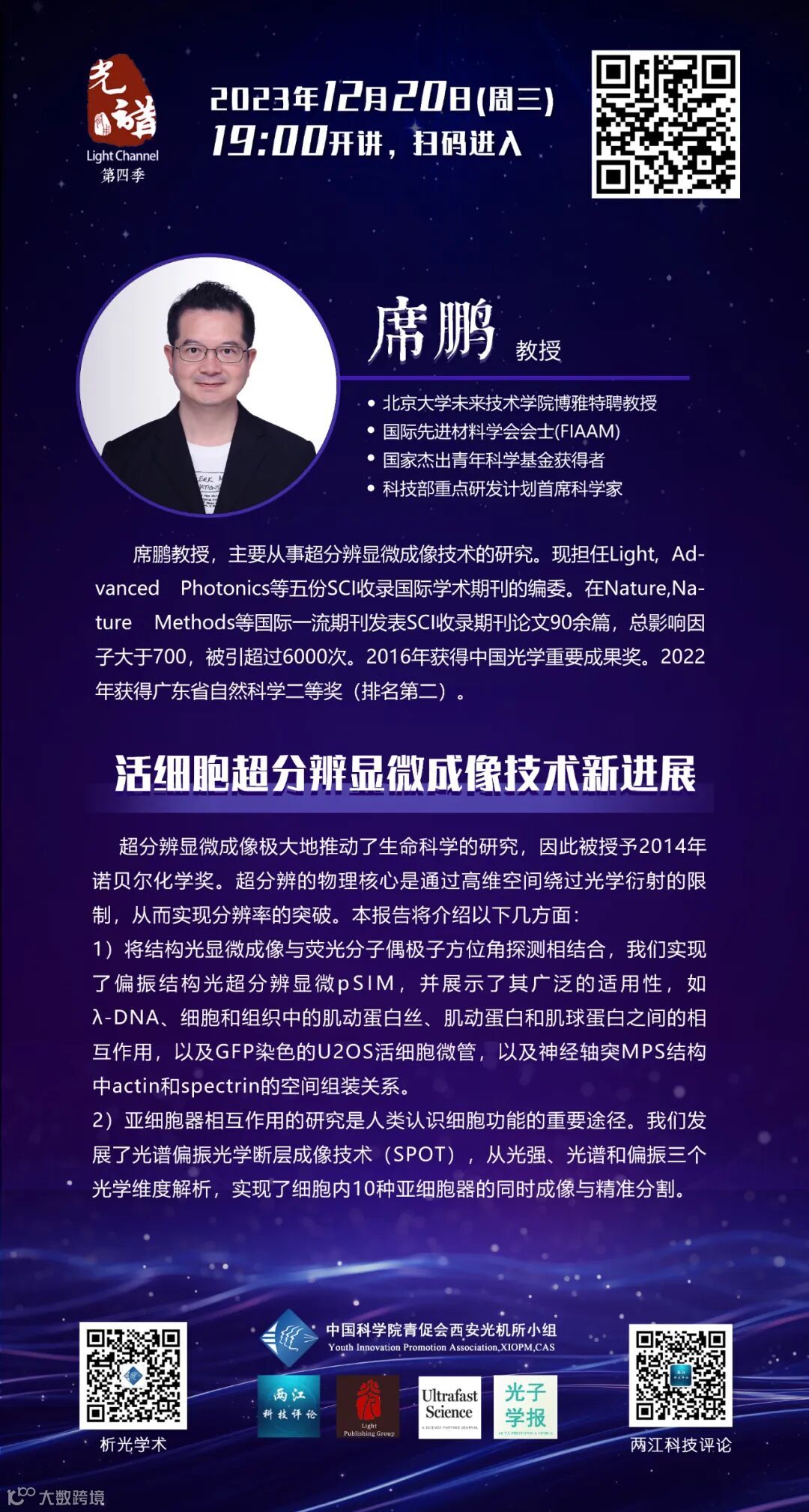 席鹏,北京大学未来技术学院博雅特聘教授,国际先进材料学会会士(FIAAM),国家杰出青年科学基金获得者,科技部重点研发计划首席科学家。主要从事超分辨显微成像技术的研究。现担任Light, Advanced Photonics 等五份SCI收录国际学术期刊的编委。在Nature, Nature Methods等国际一流期刊发表SCI收录期刊论文90余篇,总影响因子大于700,被引超过6000次。2016年获得中国光学重要成果奖。2022年获得广东省自然科学二等奖(排名第二)。