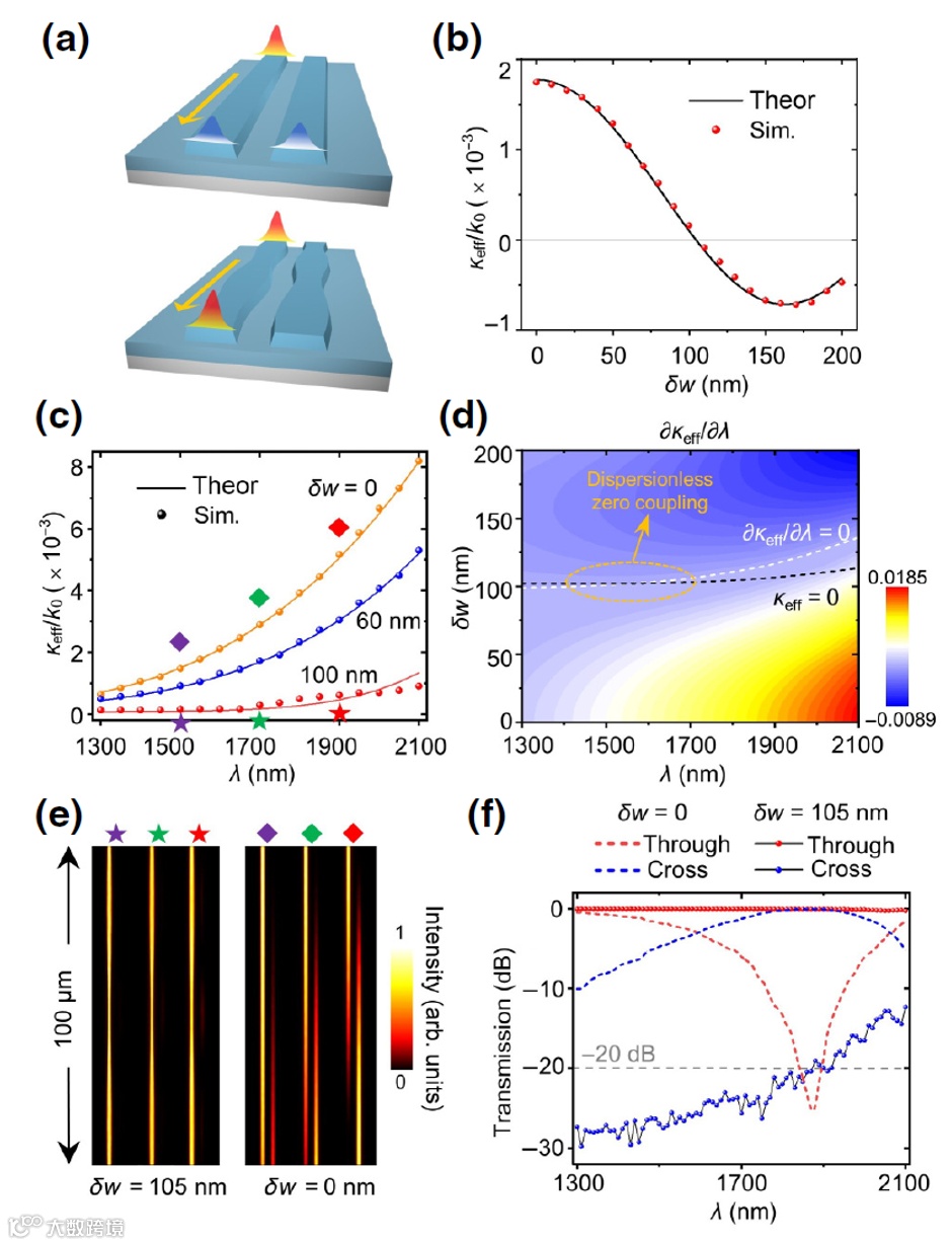 进一步分析耦合的色散关系,可以发现在一段很大的波长区间内,零耦合曲线与零色散耦合曲线几乎重叠,这表明该方案可以实现宽带的消串扰(图1(d))。从仿真结果可以看出,有调制的波导能够一直维持较高的串扰抑制(理论带宽>600 nm),而无调制的直波导则表现出随波长剧烈变化的耦合现象(图1(d-e))。事实上,这种宽带的起源是Floquet调制带来的调制色散刚好与耦合色散互相制约,最终在一定条件下获得了宽带的消串扰。