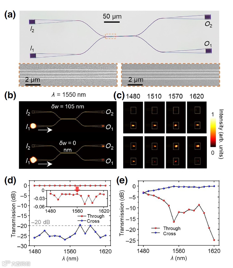 基于上述设计,研究人员在x切LNOI上制备了样品,两侧的端口分别通过Taper结构与耦合光栅I1、I2相连接(图2(a, b))。在实验中,激光从I1端口输入,在O1和O2端口接收输出信号,并通过改变输入的激光波长,以验证结构的宽带特性。实验结果如图2(b, c),对于有调制的结构(δw=105 nm)输出光总在O1端口,而对于直波导结构(δw=0 nm),两个输出端口均有光输出,并随着波长的增大,越来越多的能量耦合到另一根波导并从O2端口输出。从图2(f)的结果可以看出,该方案在1480~1620 nm的波长均能获得20 dB以上的消串扰(直波导的结果如图2(f)所示)。为进一步展示该方案的可行性,研究人员还展示了多通道宽带传输,表明了大规模集成的潜力。需要说明的是,工作中展示波导宽度为690-1110 nm,波导中心间距为1900 nm。这虽然比不上硅波导的集成度,但在LNOI体系已经属高紧凑波导体系了。此外,该结构还具有加工鲁棒性,该器件在波导宽度整体变化±60 nm均能维持较好的串扰抑制效果。