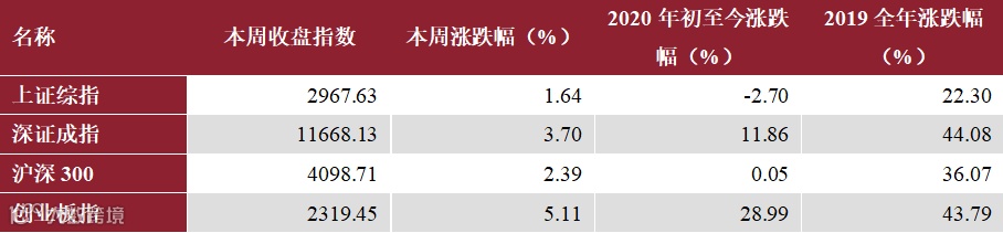 本周上证综指收涨1.64%报2967点,深证成指收涨3.7%报11668点,沪深300收涨2.39%报4098点,创业板指收涨5.11%报2319点。
