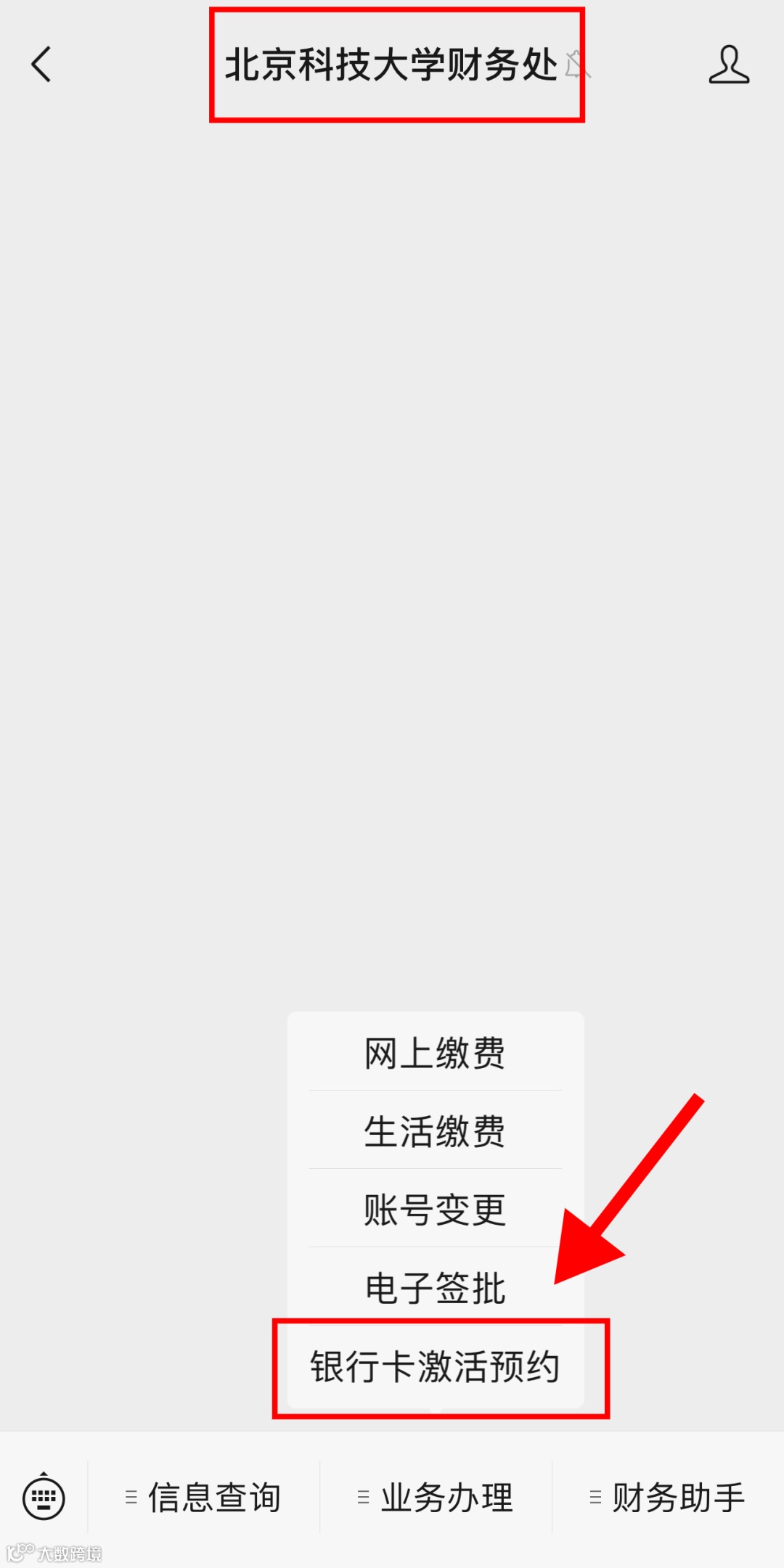 1.关注“北京科技大学财务处”微信公众号。进入公众号在“业务办理”菜单下的"银行卡激活预约”中进行预约。