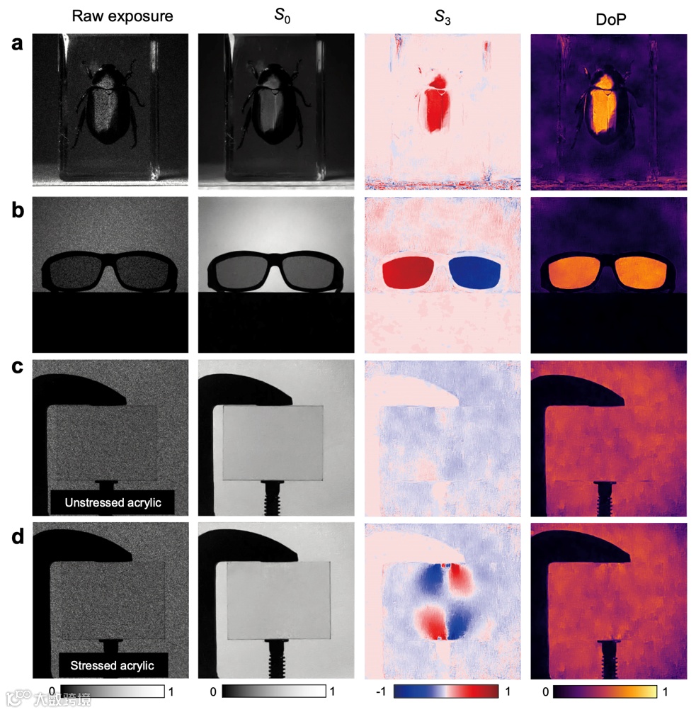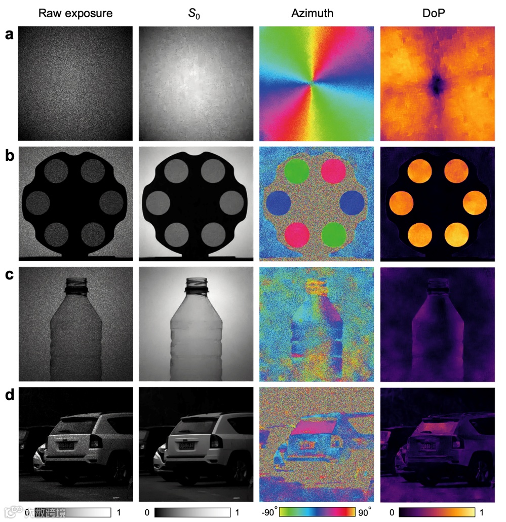 图2. 全Stokes偏振成像。使用所提出的超构表面偏振相机拍摄的室内(a到c)和室外(d)照片。在每种场景下,都展示了原始曝光图像、S0、幅角和偏振度。