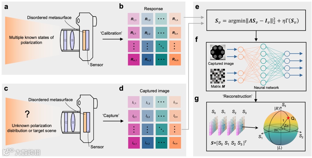 图1. 偏振相机的工作原理包括三个步骤:感知矩阵的标定、压缩采样和重建。