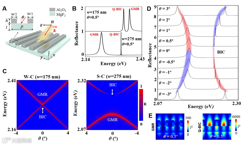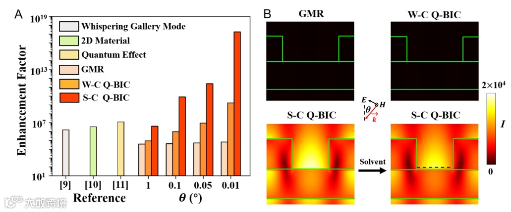 表面增强拉曼光谱(SERS)可以显著增强分子振动指纹信号,具有单分子检测灵敏度,在化学、生物、环境科学等领域被公认为是一种非常有前景的光谱检测技术。传统的金属纳米结构虽然可以提供可观的SERS增强因子,但其面临着极窄的纳米结构间隙和过度依赖近场热点分布等缺点。近年来,研究人员一直在努力探寻全介质纳米结构来取代金属结构的研究方案。然而,较弱的近场局域能力和较小的增强因子阻碍了全介质纳米结构的发展。因此,探索具有显著近场增强效应的全介质纳米结构对于推进基于SERS的纳米光学应用是十分必要的。最近几年,有关准连续域束缚态(Q-BIC)的物理学概念在纳米光子学领域引起了极大的兴趣。Q-BIC 通常具有较大的共振寿命和极高的品质因子,这将有望极大地增强全介质超表面的近场局域能力,从而增强SERS增强因子。然而迄今为止,Q-BIC全介质超应用于SERS效应的研究仍然十分缺乏。