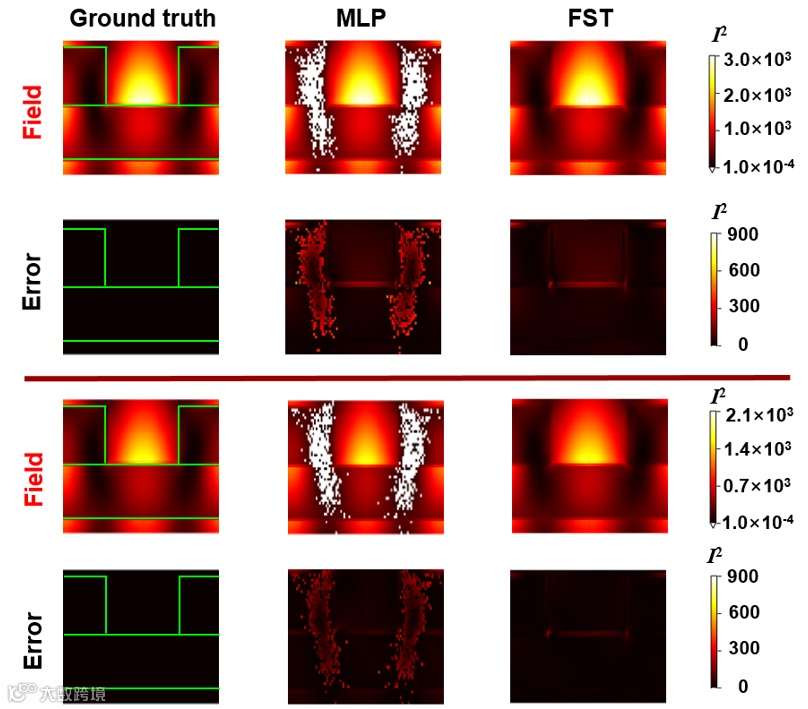 另一方面,SERS超表面的设计有两个关键点。首先,超表面结构需要在给定波长的激发光源下表现出显著的表面近场增强,这将确保提高SERS灵敏度所必需的拉曼散射信号强度。其次,在提出不同的近场增强需求时,希望快速获取符合条件的微结构参数。鉴于此,该工作提出了一种基于Transformer模型的深度学习方案,以促进全介质SERS超表面的设计,该方案由正向神经网络(FNN)和逆向神经网络(INN)组成。在图5的正向设计中,研究者们提出的Transformer模型表现出比传统的多层感知机(MLP)更加强有力的学习性能。