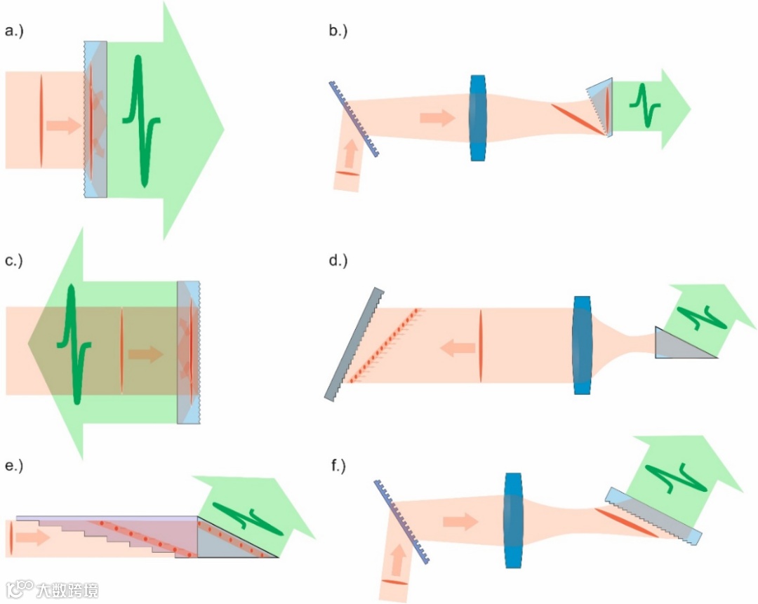 图二:新一代太赫兹源。(a)接触光栅方案,在晶体表面产生脉冲前沿倾斜的衍射光栅。在晶体内部,泵浦光束沿改变的方向传播,但强度仍与晶面平行。(b)混合光栅方案,(c)反射非线性板(RNLS)方案 (d)传统的TPFP方案;(e)多步相位掩模方案;(f)非线性梯形板(NLES)方案。