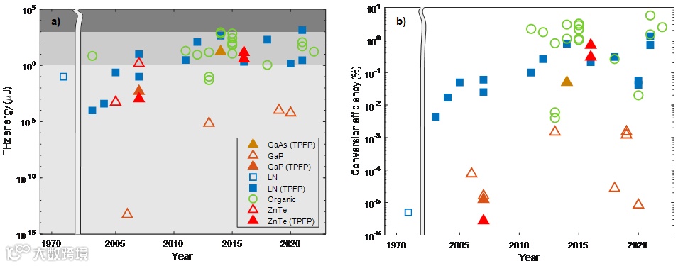 图一:过去20年成果回顾。图中以对数刻度现实了过去二十年中光整流方法产生的宽带太赫兹脉冲的能量(a)和转换效率(b)。