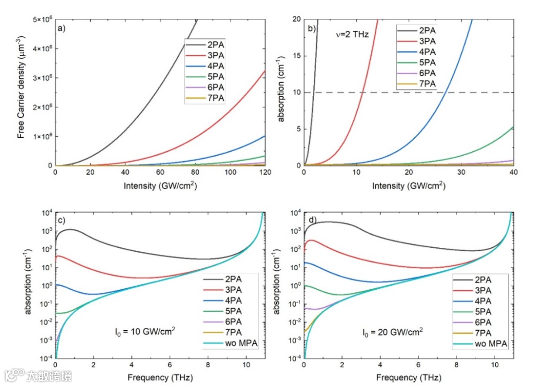 图三:不同阶数的MPA-s对吸收的影响比较。(a)展示了GaP晶体中不同多光子几首阶次的自由载流子密度和泵浦强度的近似关系;(b)展示了频率为2 THz时域强度相关的载流子吸收;(c)和(d)展示了声子-极化子单独吸收以及声子-极化子和自由载流子联合吸收的太赫兹谱。