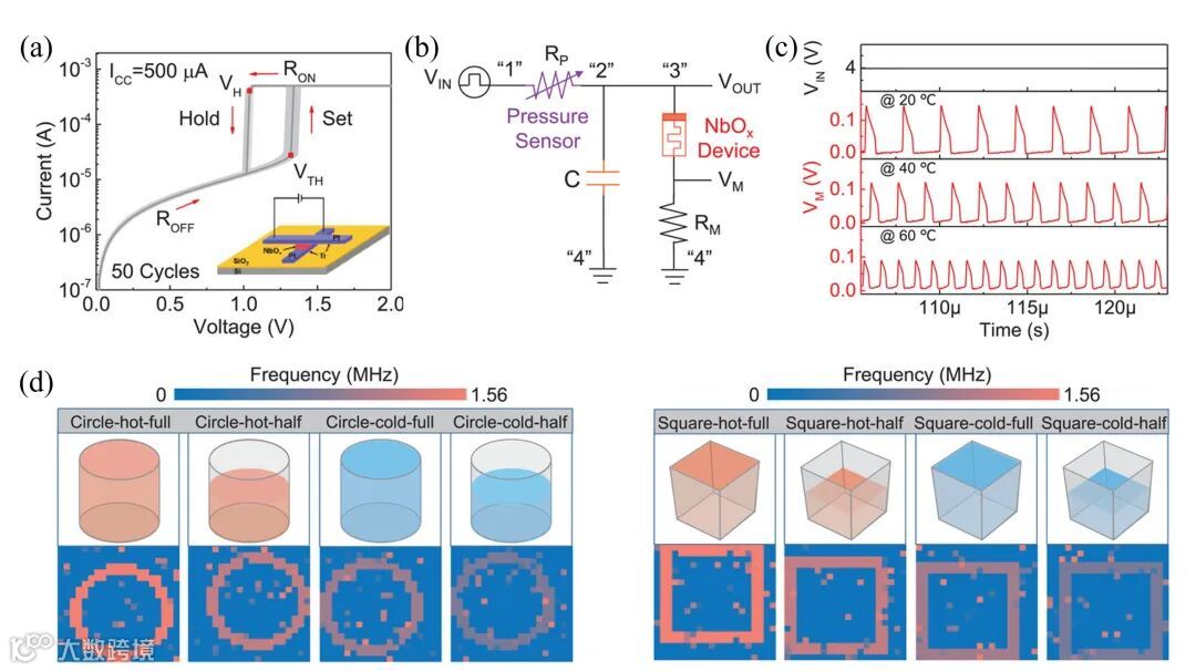 图4. (a) 氧化铌材料阈值器件的电流-电压曲线;(b) 多模神经元电路示意图;(c) 不同温度下的输出电压脉冲;(d) 基于多模式整合神经元阵列实现物体识别