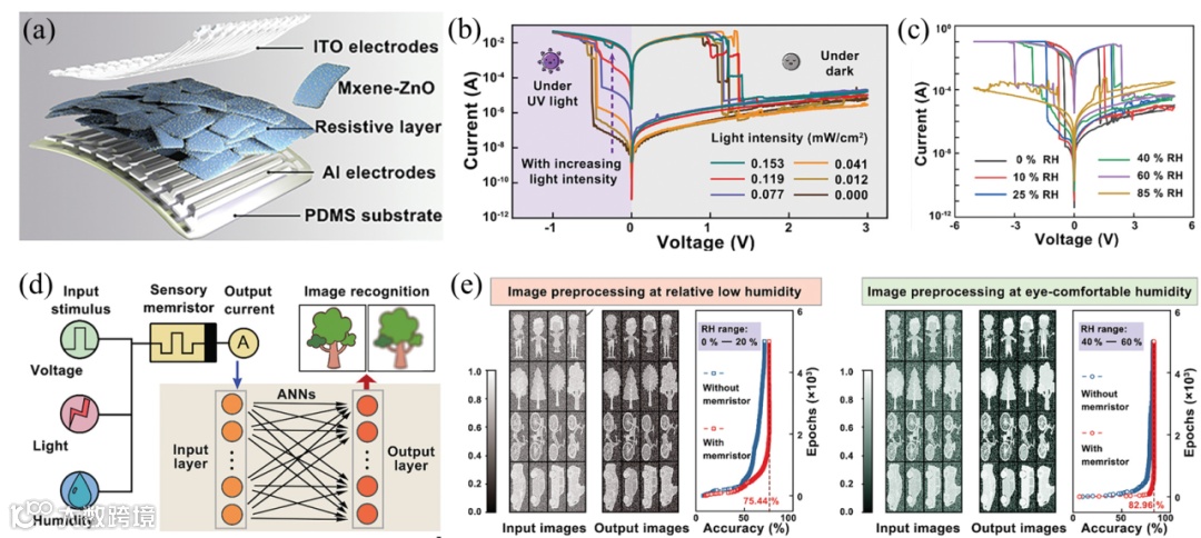 图11. (a) MXene-ZnO忆阻器阵列示意图;(b-c) 不同光照和湿度条件下的电流-电压曲线;(d) 基于MXene-ZnO器件的感存算一体化处理;(e) 不同湿度环境下的识别结果
