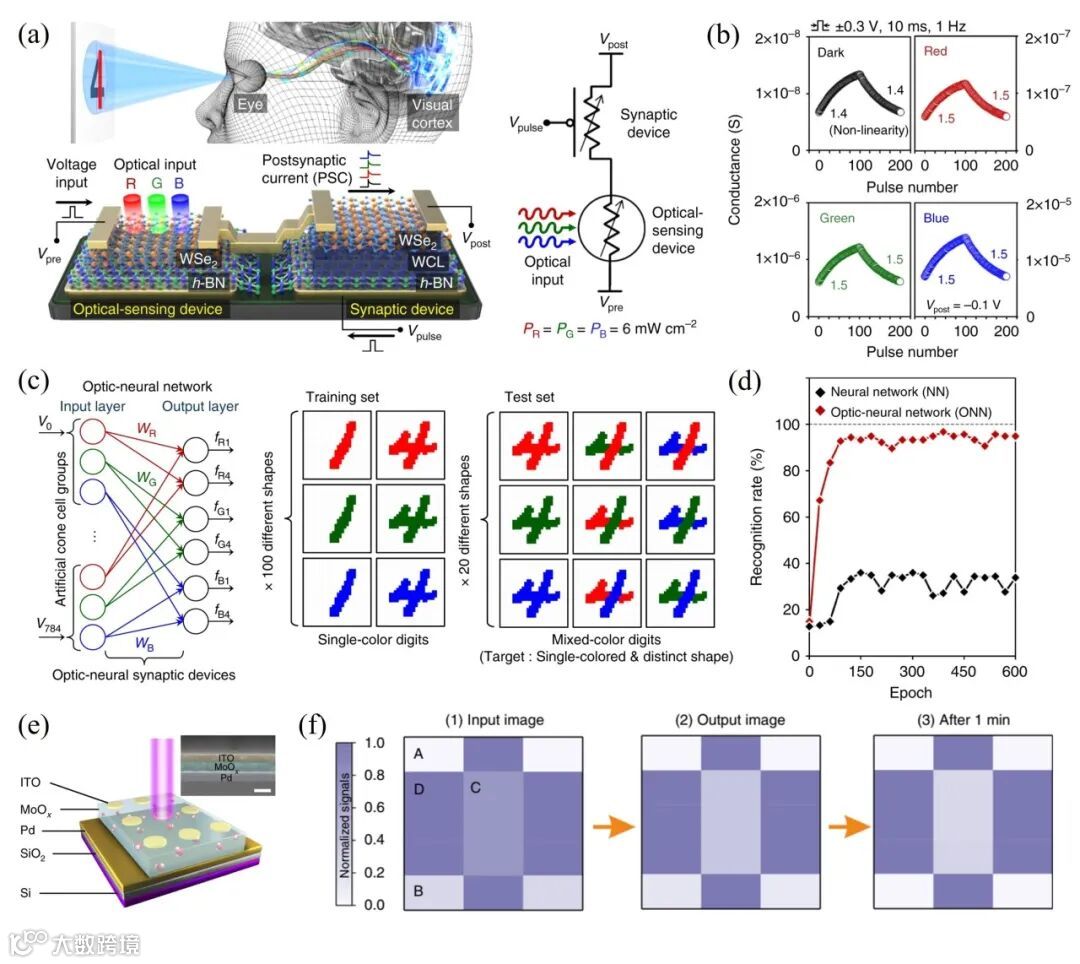 图2. (a) h-BN/WSe2结构光神经突触器件及人类视觉系统示意图;(b) 在不同光照条件下的长时增强和抑制行为;(c) 用于彩色数字图像识别的光神经网络;(d) 传统神经网络和光神经网络的识别率的对比;(e) 基于氧化钼材料光电忆阻器结构示意图;(f) 基于氧化钼光电忆阻器阵列实现的图像对比增强功能
