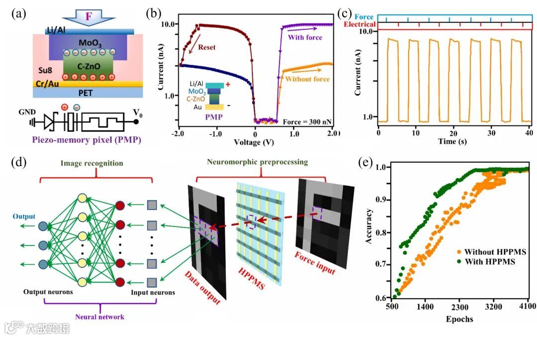 图5. (a) 压电-忆阻单元工作原理示意图;(b) 施加压力前后的电流-电压行为;(c) 压力脉冲和电压脉冲下的电学阻变置位及复位行为;(d)基于压电-忆阻单元的人工神经网络实现图像预处理和识别;(e) 预处理前后压力图像识别结果