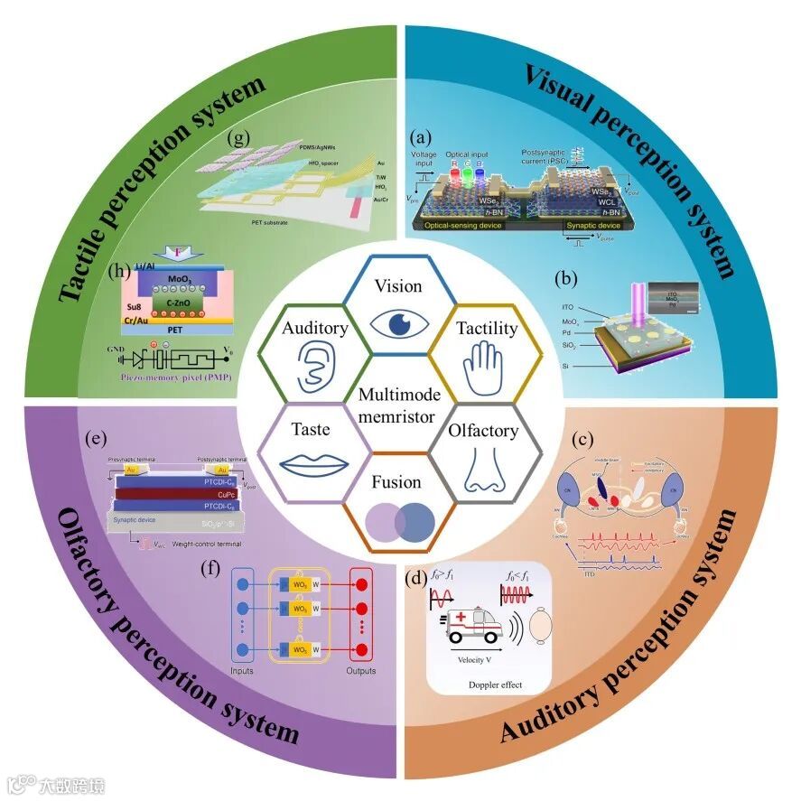 图1. 基于忆阻器件的多模式感知系统。(a-b) 具备彩色图像识别及图像预处理功能的人工视觉系统;(c-d) 基于忆阻器件实现声源动态感知及声音定位;(e-f) 可实现气体分辨及维持氧平衡的人工嗅觉系统;(g-h) 基于忆阻器的神经形态触觉系统
