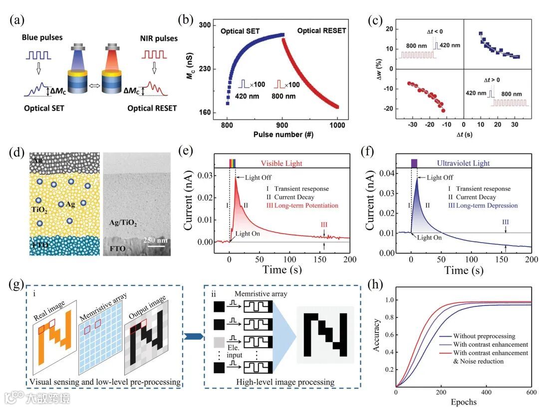 图3. (a) 全光调控忆阻器示意图;(b) 利用蓝光和近红外光实现器件电导的可逆调控;(c) 脉冲时序依赖可塑性;(d) Ag-TiO2忆阻器的结构示意图及截面TEM图;(e-f) 利用紫外光和可见光实现突触增强/抑制功能;(g) 兼具图像感知,低阶预处理和高阶处理功能的神经形态视觉系统;(h) 视网膜拟态预处理前后的图像识别过程