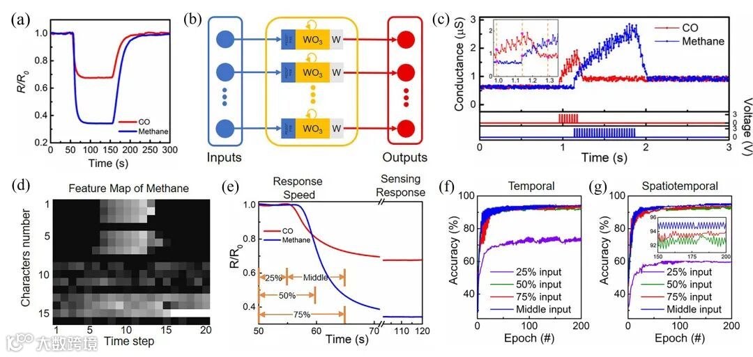 图7. (a) TGS2610传感器对一氧化碳和甲烷的响应和恢复曲线;(b) 基于忆阻器的储备池计算示意图;(c) 器件对不同脉冲序列的响应结果;(d) 储备池计算系统提取得到的甲烷特征图;(e) 特征提取示意图;(f-g) 减少时间和空间维度信息的识别精确度