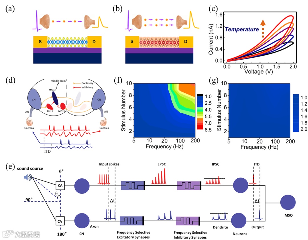 图9. (a-c) 单层硫化钼材料人工突触器件及其在焦耳热驱动下的电导增强行为;(d) 声音定位示意图;(e) 类脑计算实现声音定位工作原理;(f-g) 不同条件下的频率和数量输出结果