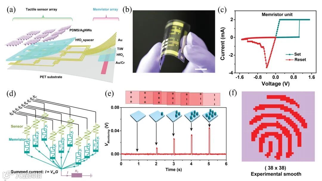 图6. (a) 组合压力传感器和忆阻器阵列的近传感器计算系统;(b) 人工皮肤系统实物图像;(c) 氧化铪材料忆阻器的电流-电压曲线;(d-f) 对于压力刺激的实时感知和噪声降低处理