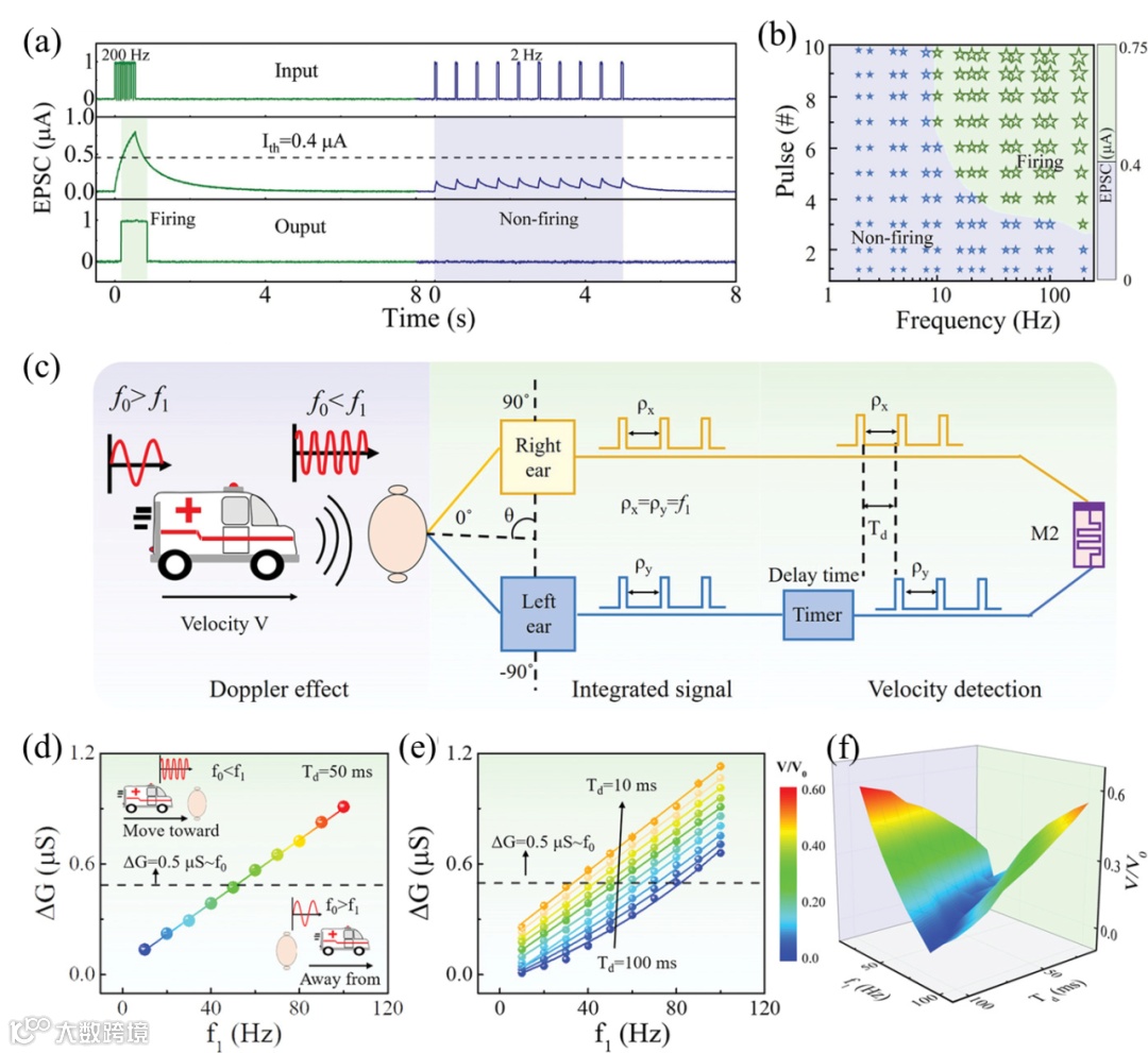 图10. (a) 刺激过程中高通滤波和触发过程;(b) 触发/非触发操作的实验条件;(c) 多普勒测速电路设计;(d-e) 不同延迟时间下的脉冲频率依赖电导变化特性;(f) 多普勒测速实验结果
