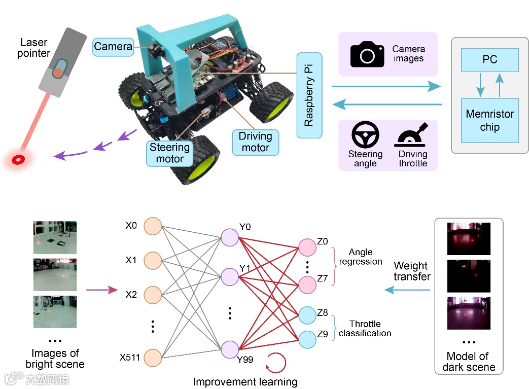课题组基于该忆阻器芯片完成了多个片上增量学习演示任务,涉及图像分类、语音识别、控制任务的样本增量学习和类别增量学习。增量学习是指神经网络模型在已有知识的基础上,通过少量新类别或新样本数据快速地学会新知识,且不会遗忘已有知识。装载该忆阻器芯片的小车在只适应暗场环境时,通过少量数据增量学习便同时具备了亮场环境下的适应能力。