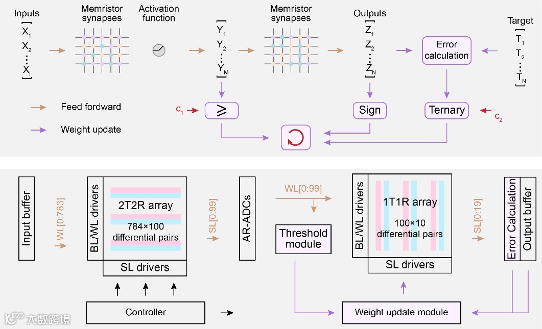 当前国际上的相关研究主要集中在忆阻器阵列层面的学习功能演示,然而实现全系统集成的、支持高效片上学习的忆阻器芯片仍面临较大挑战,至今还未实现,主要在于传统的反向传播训练算法所要求的高精度权重更新方式与忆阻器实际特性的适配性较差。具体而言,一是由于忆阻器固有的非理想特性,要精确更新权重则需要对忆阻器反复校验编程,产生了大量的功耗和延迟;二是在权重更新过程中,需要对不同忆阻器施加不同的操作条件,难以实现高效并行的电导调制策略;三是高精度的权重更新量计算导致了过高的开销。