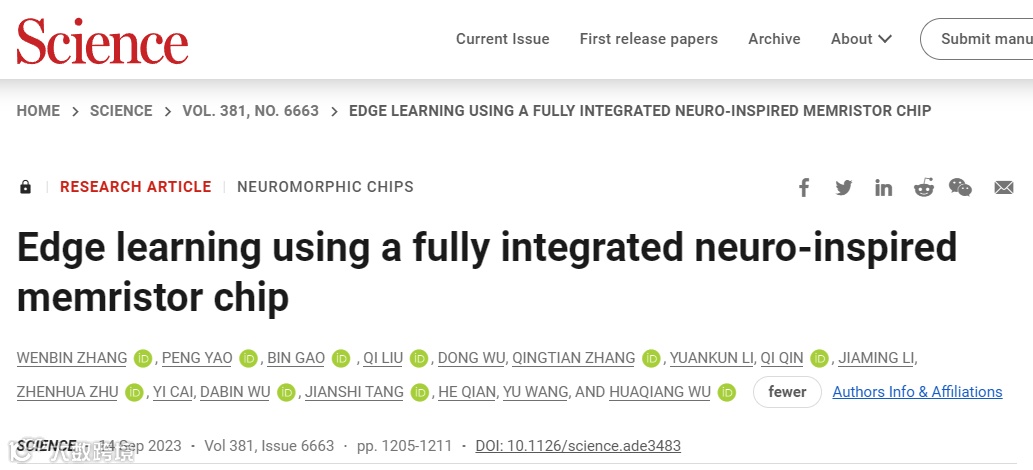 该研究成果今天以“面向边缘学习的全集成类脑忆阻器芯片”(Edge Learning Using a Fully Integrated Neuro-Inspired Memristor Chip)为题在线发表在Science上。