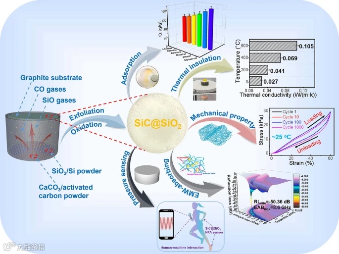 中文题目:具有超宽带电磁波吸收的多功能SiC@SiO₂纳米纤维气凝胶