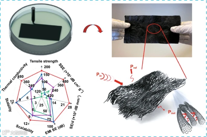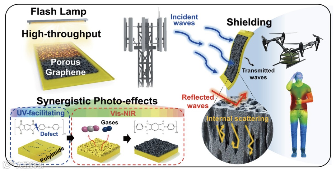 中文题目:协同光效应的闪光诱导高通量多孔石墨烯用于电磁干扰屏蔽