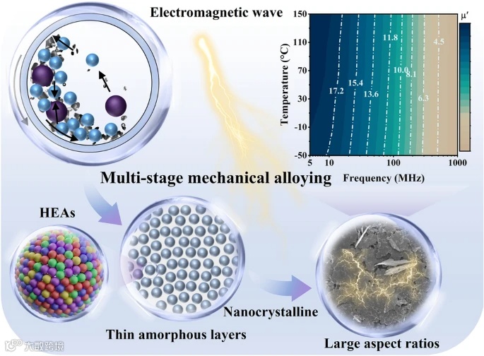 中文题目:多级机械合金化策略构建高熵合金微观结构设计用于温度稳定兆赫电磁吸收