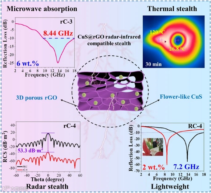 中文题目:CuS@rGO微纳轻质气凝胶用于超宽微波吸收能力和红外隐身性能