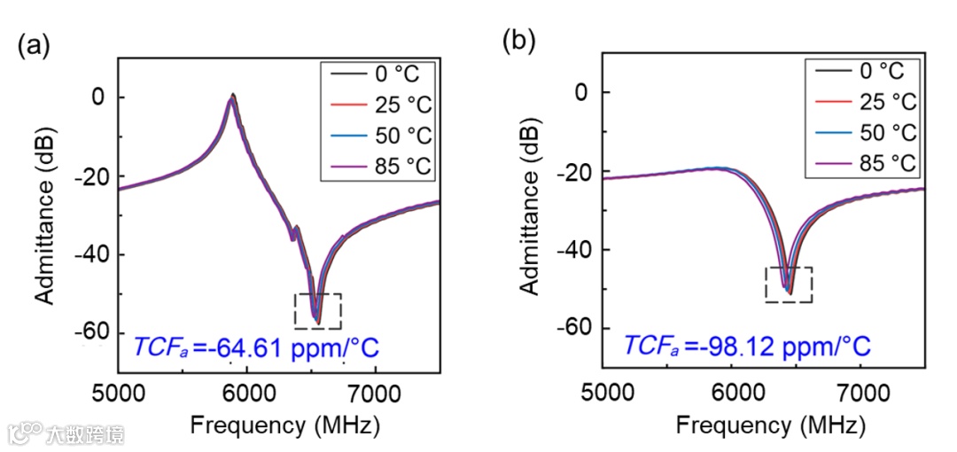 图4(a) LiNbO₃/SiC谐振器在不同温度下的导纳响应 (b) LiNbO₃体材料谐振器在不同温度下的导纳响应。