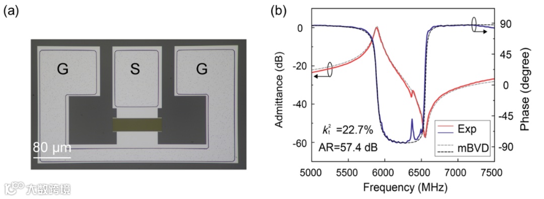 图3(a) LiNbO₃/SiC谐振器的光镜照片 (b) LiNbO₃/SiC谐振器实测导纳、相位曲线及mBVD电路模型拟合结果。