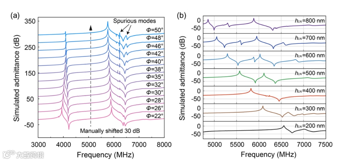 图2(a) 不同传播角下LiNbO₃/SiC谐振器的导纳模拟响应 (b) 不同LiNbO₃薄膜厚度下LiNbO₃/SiC谐振器的导纳模拟响应。