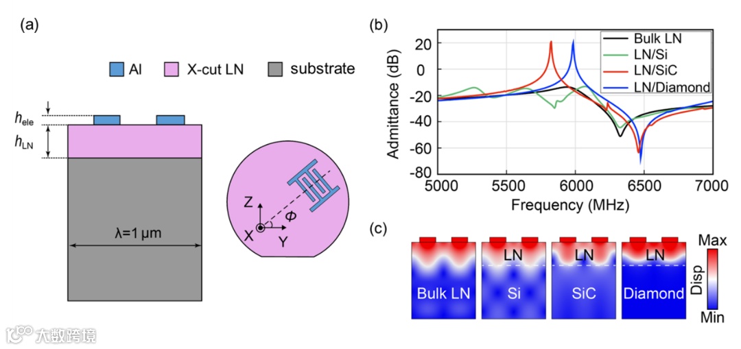 图1(a) 压电异质双层结构谐振器的周期性模型示意图 (b) 采用不同衬底的异质结构谐振器的导纳模拟响应。(c) 采用不同衬底的异质结构谐振器的位移模拟分布图。