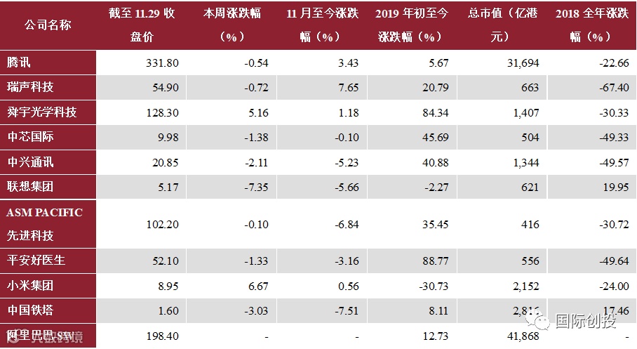 港股方面,本周小米集团公布2019年第三季度业绩报告,小米集团2019年第三季度总收入536.6亿元,同比增长5.53%,是小米创办以来总营收最高的季度;经调整后净利润为34.72亿元,同比增长20.3%。此外,小米2019年前三季度净利润总计92亿元,超去年全年。报告期内,小米集团现金总储备达到566亿元。同时小米还在推进5G手机研发,2019年第三季度研发开支20亿元,同比提升32.5%。小米集团董事长兼CEO雷军表示,小米将全力推动5G手机的研发和推广,计划2020年推出10款以上的5G手机。