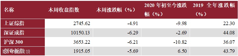本周上证综指收跌4.91%报2745点,深证成指收跌6.29%报10150点,沪深300收跌6.21%报3653点,创业板指收跌5.69%报1915点。