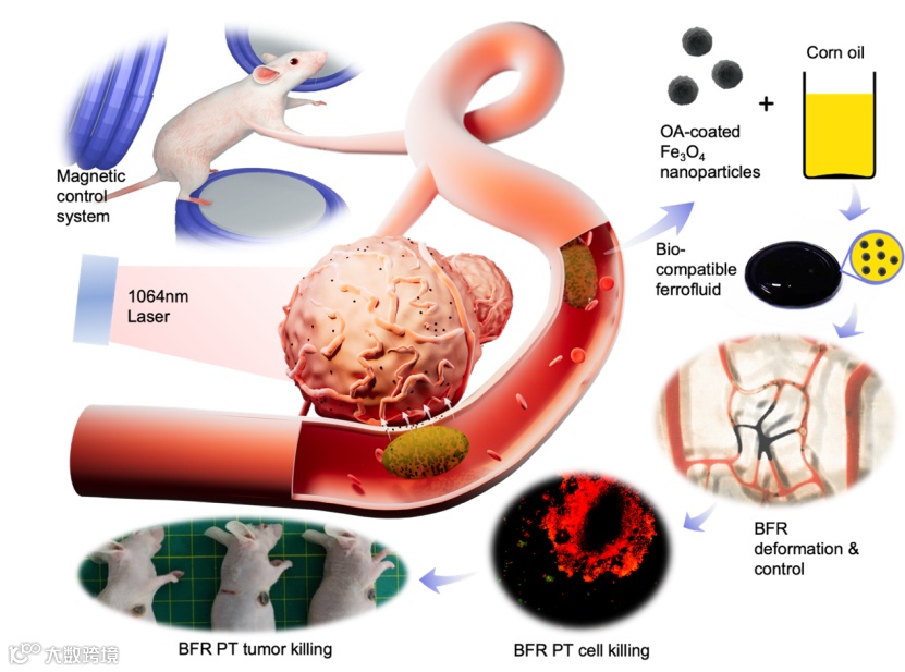 图1.用于近红外 II 窗口肿瘤光热治疗的生物兼容磁流体液滴机器人(BFR)概念图。