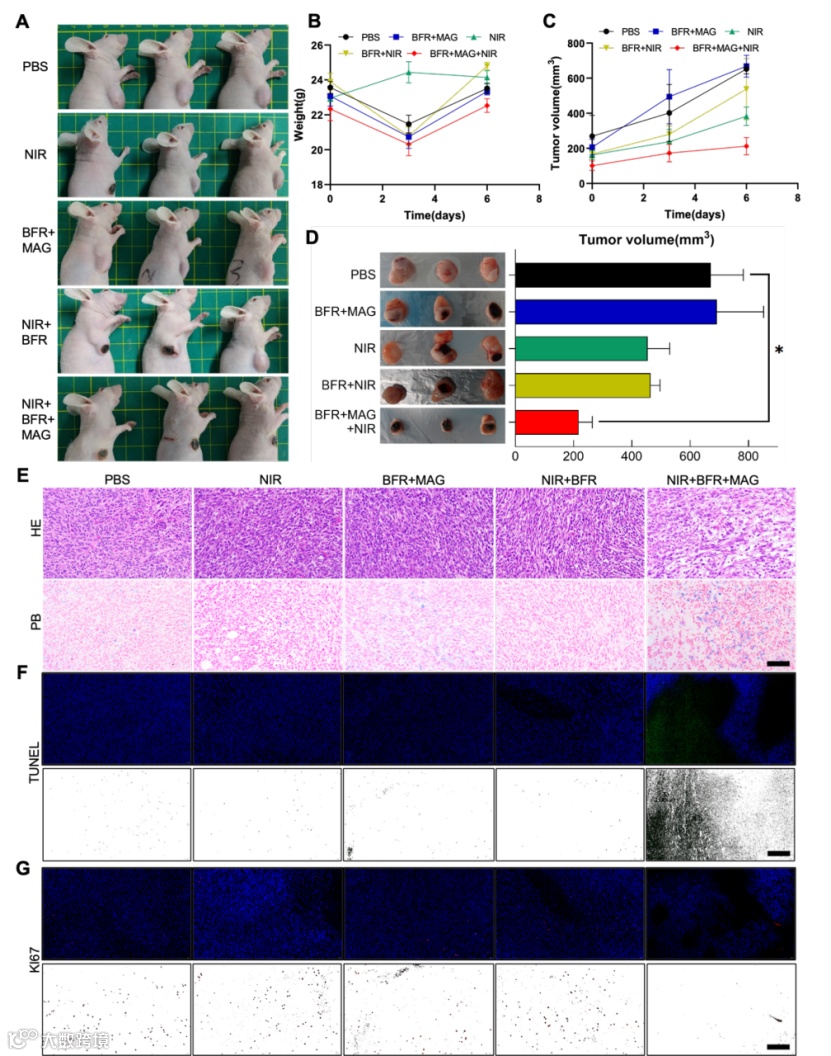 图4. 体内肿瘤杀伤实验。(A) 各实验组裸鼠在治疗六天后的肿瘤情况,(B) 体重曲线。(C) 肿瘤大小曲线。(D) 六天治疗后离体肿瘤组织的体积统计。(E) 小鼠肿瘤切片的 H&E 染色结果。比例尺:50 微米。(F) 和 (G) 肿瘤切片的 TUNEL 和 KI67 染色结果。黑色背景图像为荧光图像,白色背景图像为特征荧光图像。比例尺:100 μm。