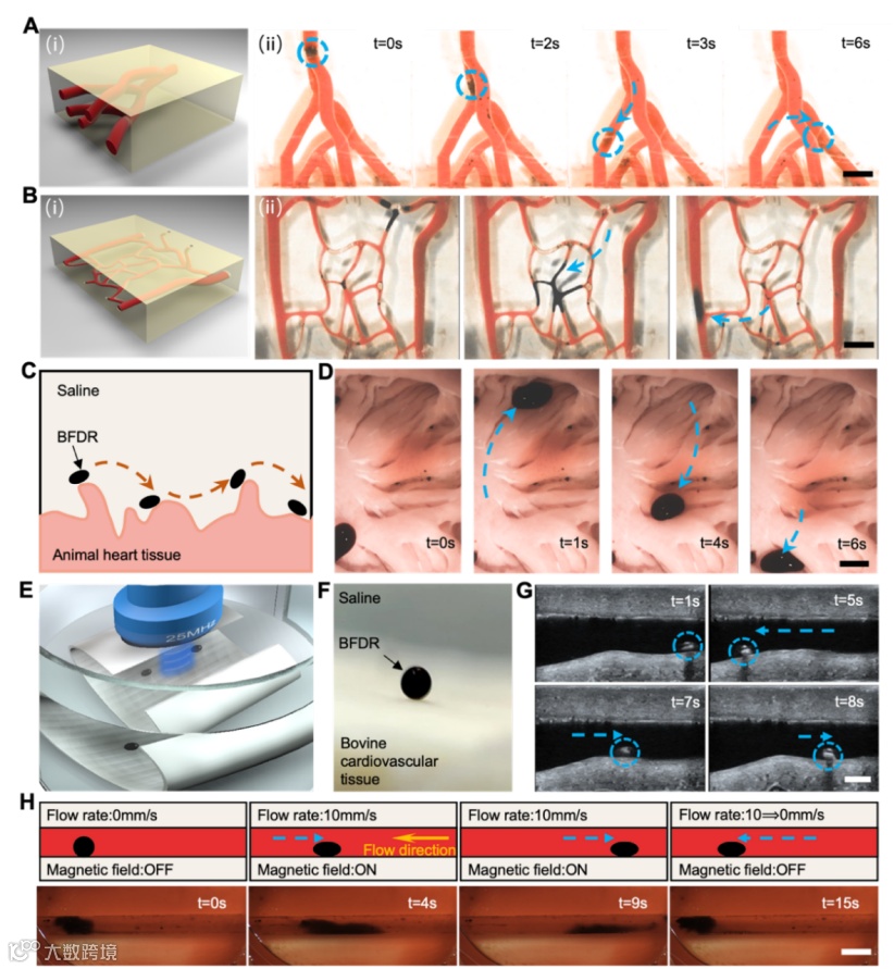 图3. BFR在体外模拟血液循环环境中的运动。(A) BFR 可被控制移动到全血环境中三维血管模型的任意分支。比例尺:5 毫米:(B) BFR 在肝门静脉血管模型中的运动控制,显示了 BFR 由于可变形性和分裂能力而在血管中的可移动性。比例尺:2 毫米。(C) 磁流体机器人越过障碍物的侧面示意图。(D) BFR 在磁阻力作用下穿过障碍物和心脏组织表面的沟槽。(E) BFR 超声成像示意图。比例尺:5 毫米:(F) BFR 在一块牛心血管组织的内表面形成一个稳定的球体。(G) 超声成像视频快照,显示运动控制过程中 BFR 在不同时间的位置。比例尺:2 毫米。(H) BFR 在全血环境中逆流而上。比例尺:1 毫米。