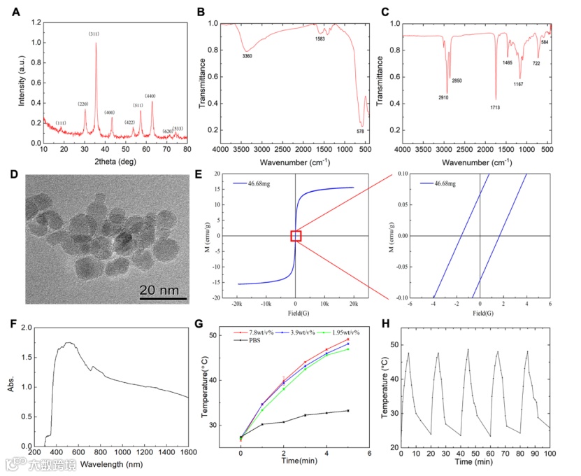 图2. BFR表征。(A)Fe3O4纳米粒子的 XRD 图。(B)Fe3O4纳米颗粒的傅立叶变换红外图。(C)油酸包裹Fe3O4纳米颗粒的傅立叶变换红外图。(D) BFRs 中纳米粒子的透射电子显微镜(TEM)结果。(E) 所制备磁流体的磁滞线。(F) 磁流体的紫外-可见-近红外吸收光谱。(G) 不同浓度的BFR在 1064 纳米近红外照射下的温度曲线。(H) 5个加热-冷却循环过程中BFR的光热稳定性研究。